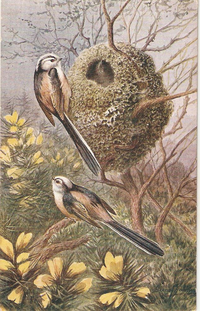 \"Long TailedTite Birds\" Nice vintage Engish postcard