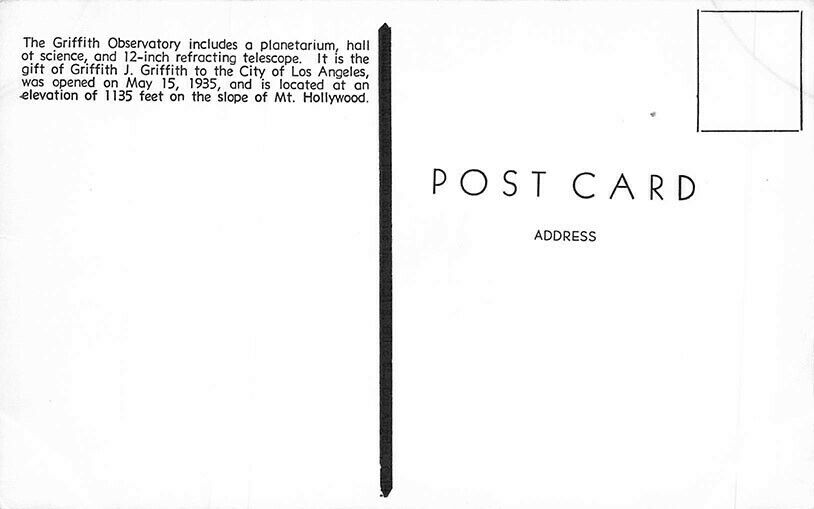 Los Angeles CA Griffith Observatory Real Photo Postcard