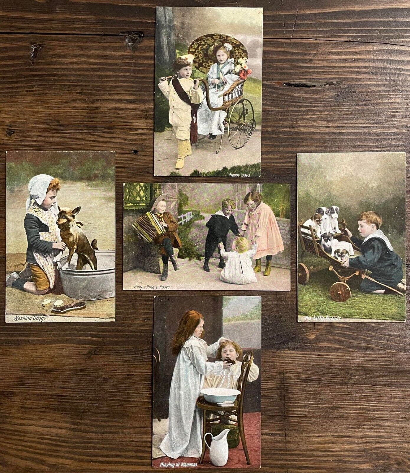 Lot 4 british vintage postcards children playing scenes happy days puppy dog pet