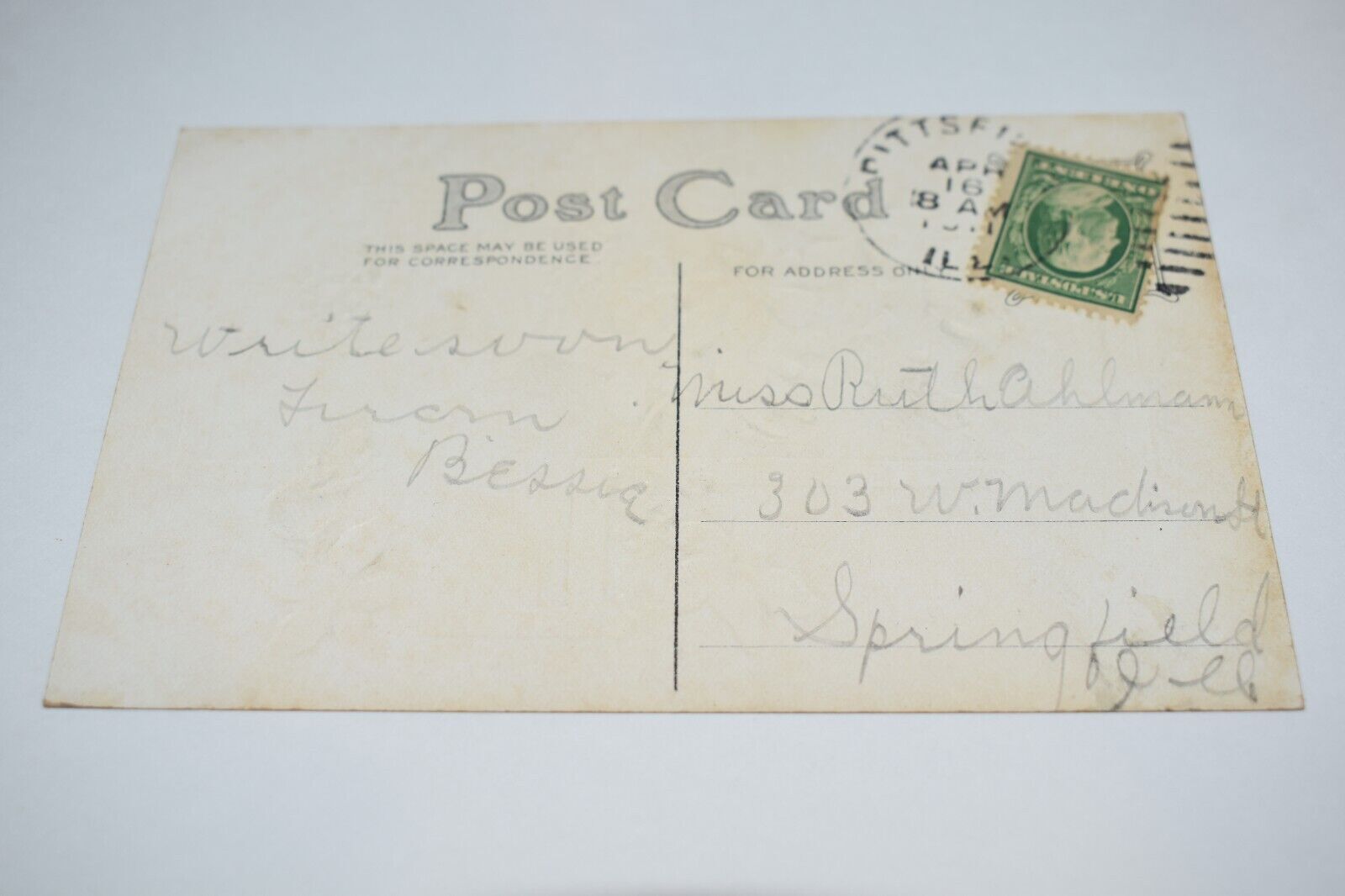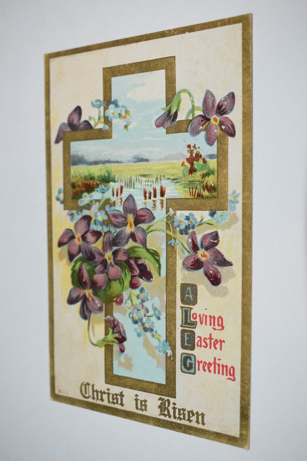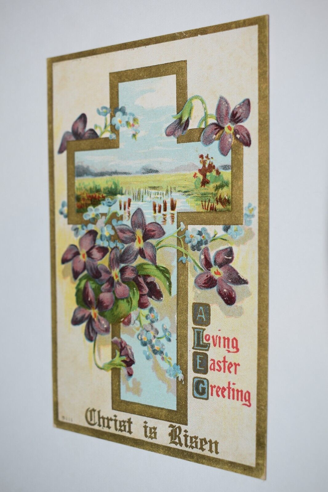 Loving Easter Greeting Christ Is Risen Gold Cross Spring Scene Purple Flowers Embossed Postcard 5111Posted with a green 1-cent Benjamin Franklin stamp and a 1911 cancel mark.Combined shipping is available. See store for related items.