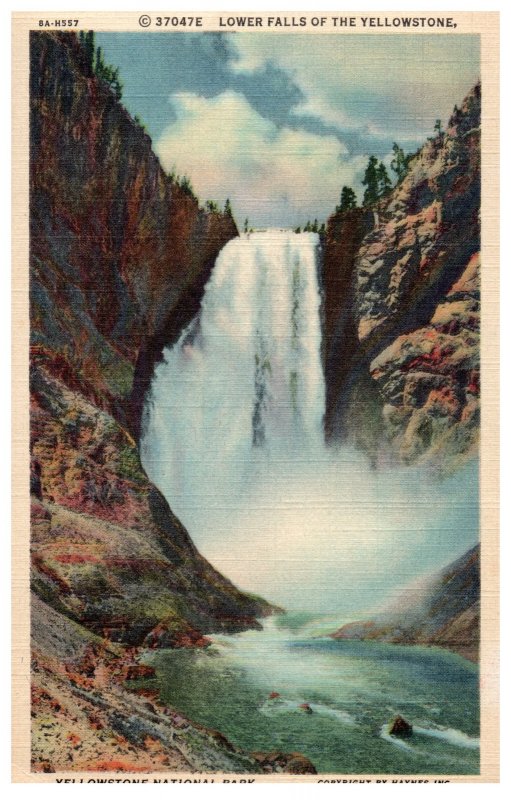 This vintage postcard features the breathtaking Lower Falls of the Yellowstone River in Yellowstone National Park. Captured in exquisite detail, it showcases the falls cascading amidst rugged cliffs and serene waters. This card was published by Haynes Inc., Yellowstone Park, Wyoming. It is postmarked from 1938 and includes a 1 cent George Washington stamp. Condition: May have wear typical of old postcards such as worn edges, stains, writing, creases, ink marks, or minor tears. Please review all photos. Check our store for more postcards and other vintage items! Combined shipping available for most items.