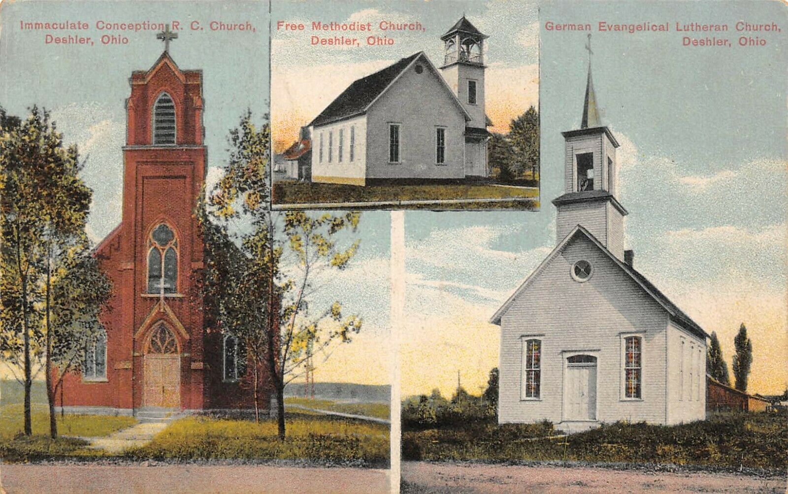 LP32 Deshler Ohio Postcard Churches Methodist German Evangelical Lutheran