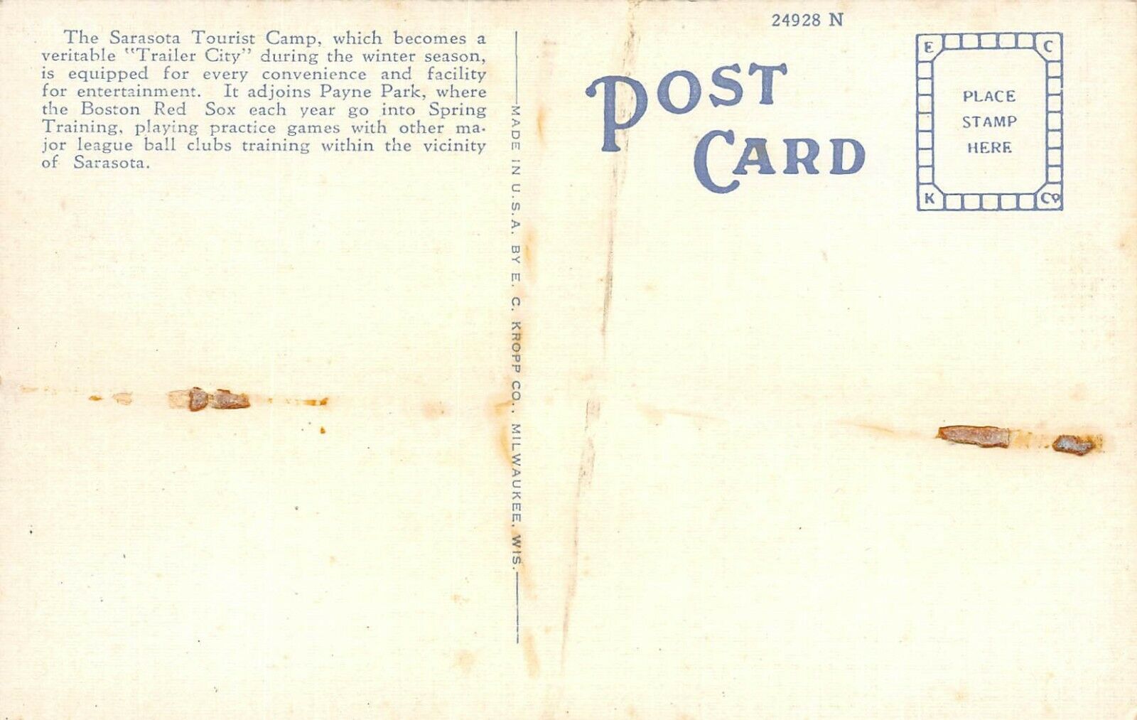 LP73 Sarasota Florida Postcard Red Sox Baseball Training Camp