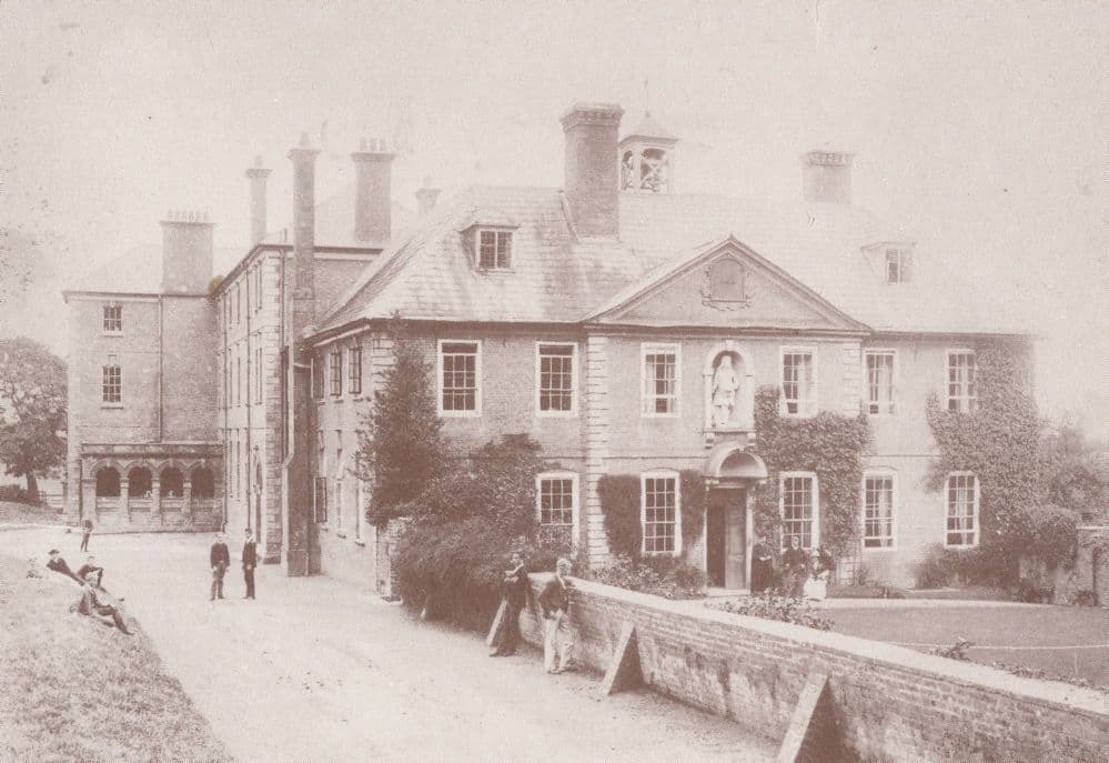 zx43 An original souvenir postcard undated but circa 35 years ago origin showing this specialist early view of Lucton School with teachers gathered outside the entrance (and pupils too) unused and mint