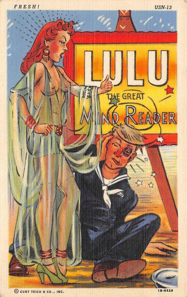 Very Good. Vintage Postcard. *Scroll Down to see an image of the back of the postcard. Lulu The Mind Reader Redhead Pin-Up Girl Topless Nude Risque Comic Navy 40s WWII Lulu The Mind Reader Redhead Pin-Up Girl Topless Nude Risque Comic Navy 40s WWII Click images to enlarge Description Vintage Postcard. There is a flat rate of $1.00 to ship anywhere within the U. S. Multiple items will have a combined shipping rate of only $1.00. International - $1.50. Please check our other items in our Hip store: Visit My Hip Store. Please feel free to contact me with any questions you may have. All cards sold are vintage, no reproductions. Images sell!Get Supersized Images & Free Image HostingCreate your brand with Auctiva'sCustomizable Templates.Attention Sellers - Get TemplatesImage Hosting, Scheduling at Auctiva.com.Track Page Views WithAuctiva's Counter