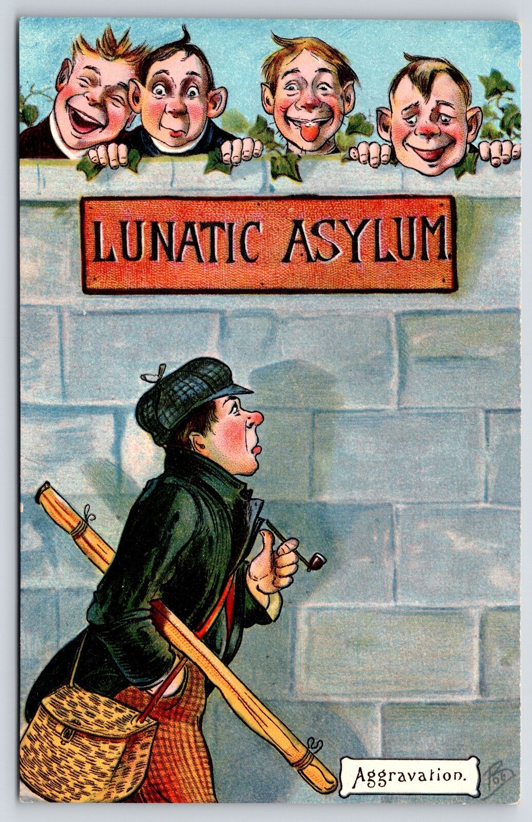 Lunatic Asylum Comic~"Aggravation" Passerby~Inmates Pop Heads Over Wall~c1910 PC