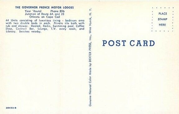 Cape Cod, Orleans, Massachusetts, Governor Prence Motor Lodges, Pool Chrome Postcard Publisherprinter: Dexter No. 20433-B Image: Bright and clean Postmark: None Corner Condition: Sharp Faults/Other: