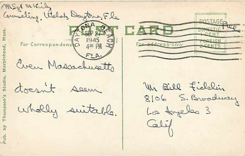 Marblehead, Massachusetts, Harbor Early Printed Postcard Postmark: 1945 Publisher/Printer: Thompson's Studio Image: Nice with cancel markings top right Corners: wear Faults/Other: