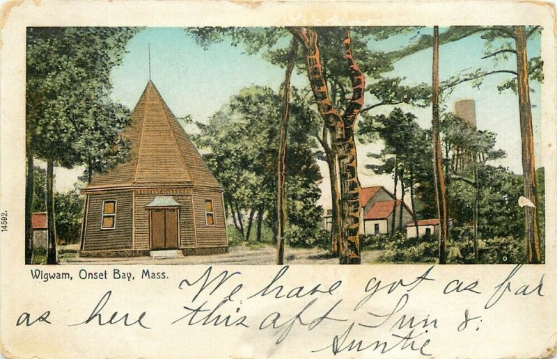 Early Printed Postcard Onset Bay, Massachusetts, Wigwam Postmark: 1906, Undivided Back Image: Nice with writing bottom margin Corners: Wear Faults/Other: Has a little edge wear