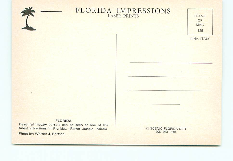 Macaw Parrots Parrot Jungle Miami Florida Macaw Parrots Parrot Jungle Miami Florida Country: Era: Publisher: Size: Type: * We ship your new Postcards in plastic sleeve and also protective cardboard mailer fo ... Read More