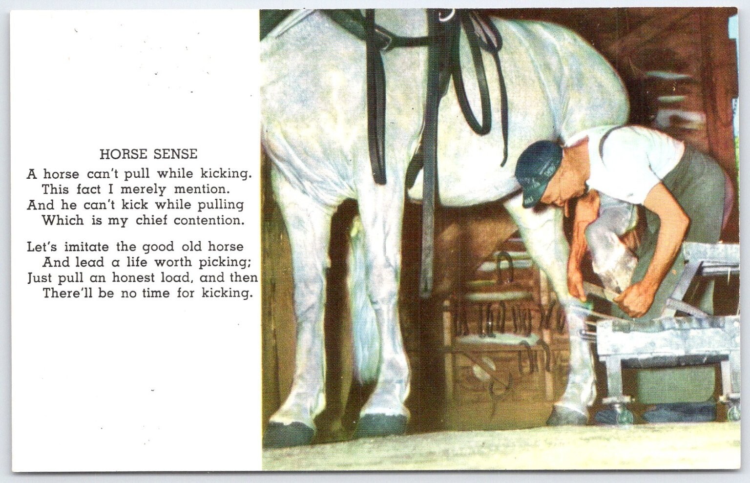 Discover a piece of Mackinac Island's rich history with this vintage Curteichcolor postcard, showcasing the skilled craft of blacksmith Herbert Benjamin. The captivating image features Benjamin diligently at work, expertly shoeing a horse, a practice he maintained for over five decades on the island. The scene is complemented by a charming poem titled "HORSE SENSE" on the left, adding a unique narrative touch to this collectible piece.This "Natural Color Reproduction" postcard, identified by its Curteichcolor Art-Creation imprint, captures the vibrant hues and details of this traditional trade. It offers a fascinating glimpse into the daily life and heritage of Mackinac Island, Michigan, highlighting the dedication of its long-standing artisans. A must-have for collectors of Michigan memorabilia, equine themes, or those with an appreciation for historical trades and Americana.