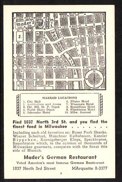 Mader's German Restaurant Map Milwaukee WI Post Card 5130