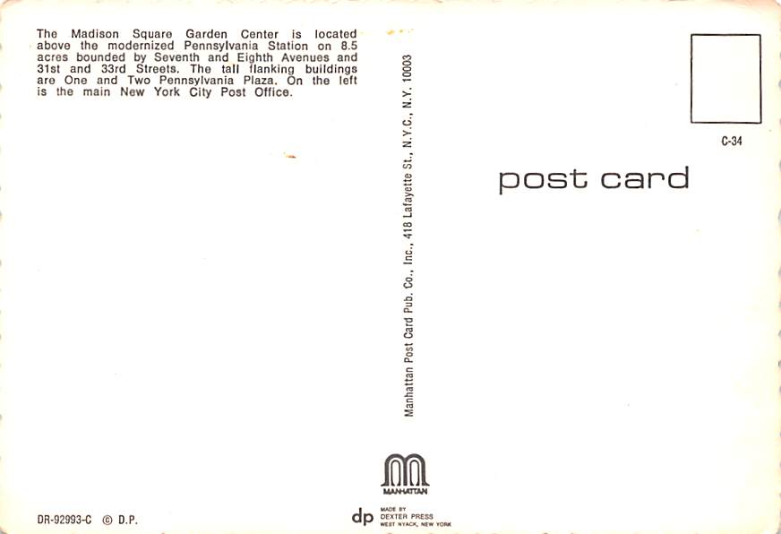 Madison Square Garden Center - New York City Grade: 1 Category: Continental Size Postcard, Approx 4 in x 6 in (10 cm x 15.25 cm) Product Size: Continental size: 4X6 inches (10.5 cm x 15 cm) Grading Scale: Grad ... Read More