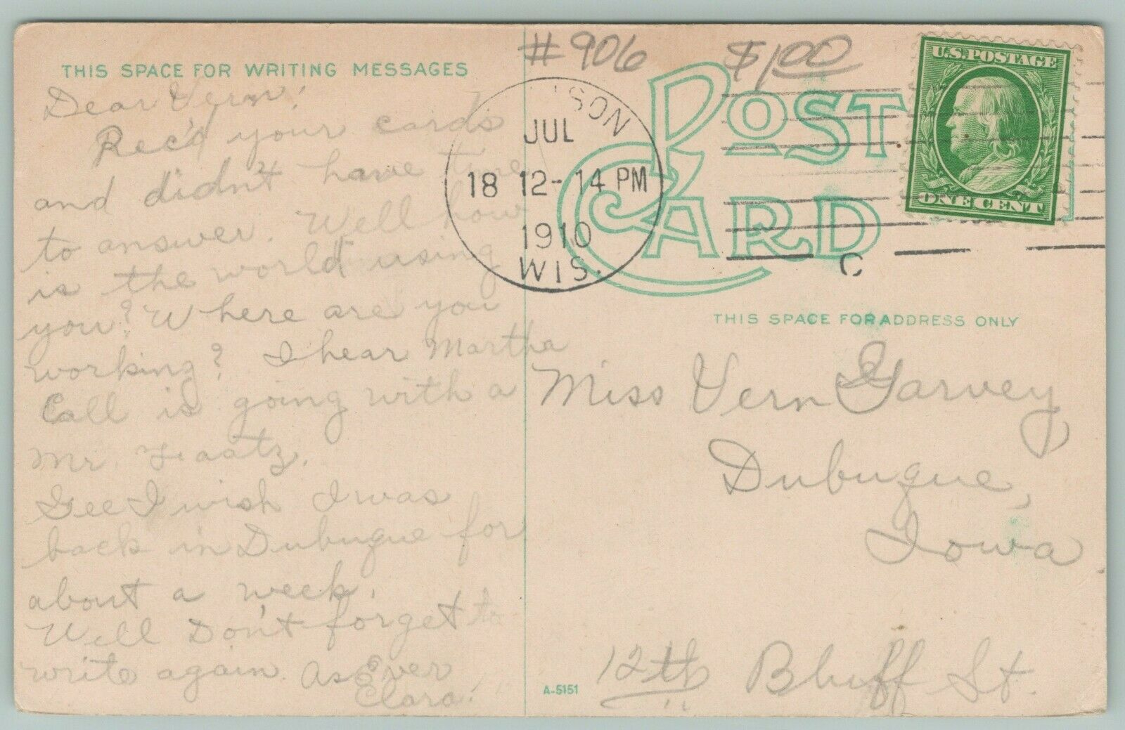 Using the photo magnifier, please examine photos carefully, both front and back, for flaws. The back will sometimes reveal nicks or bends that you cannot see from the front. Double-click the image for super size photo. Colored lines are from the scanner and are not on the postcard