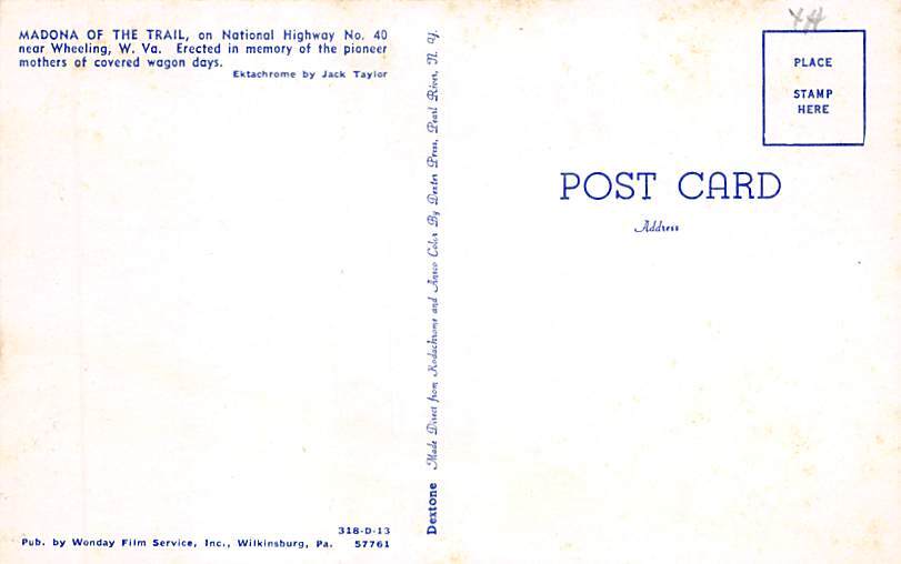 Madonna of the Trail, Wheeling, West Virginia WV Postcard - Unused