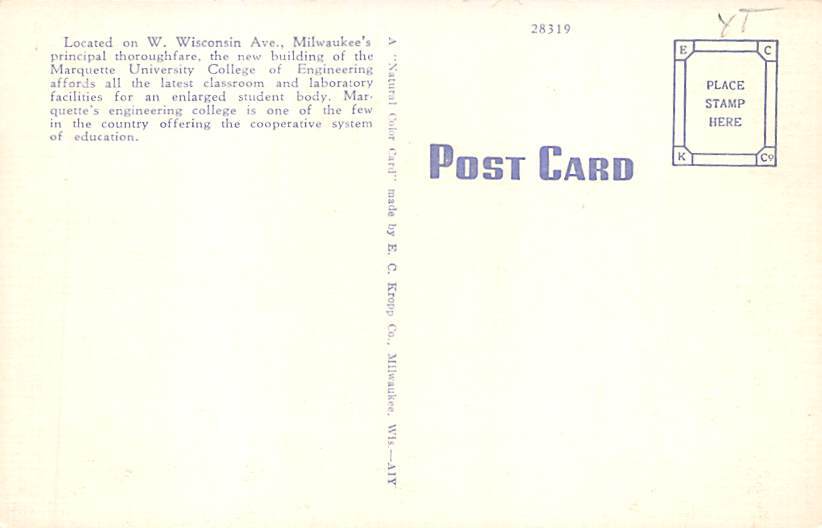 Maequette University Engineering Building Milwaukee WI Grade: 1 Size: Regular Size Postcard - approximately 3 1/2 inch x 5 1/2 inch (9 CM x 14 CM) Grading Scale: Grade 1 = Perfect corners Grade 2 = Very Minimal ... Read More