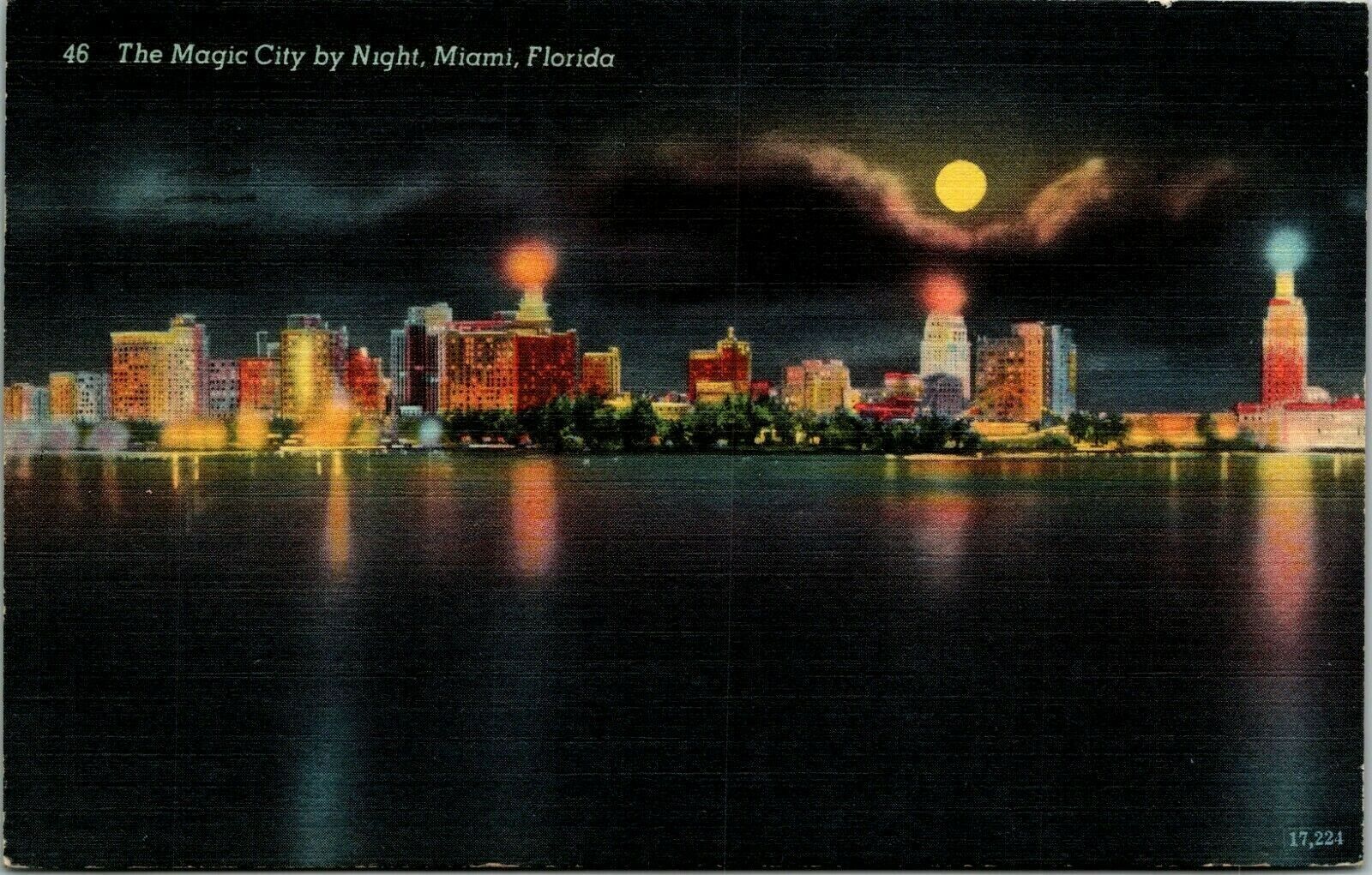 Magic City by Night, Miami, Florida moon, clouds, water reflection postcard