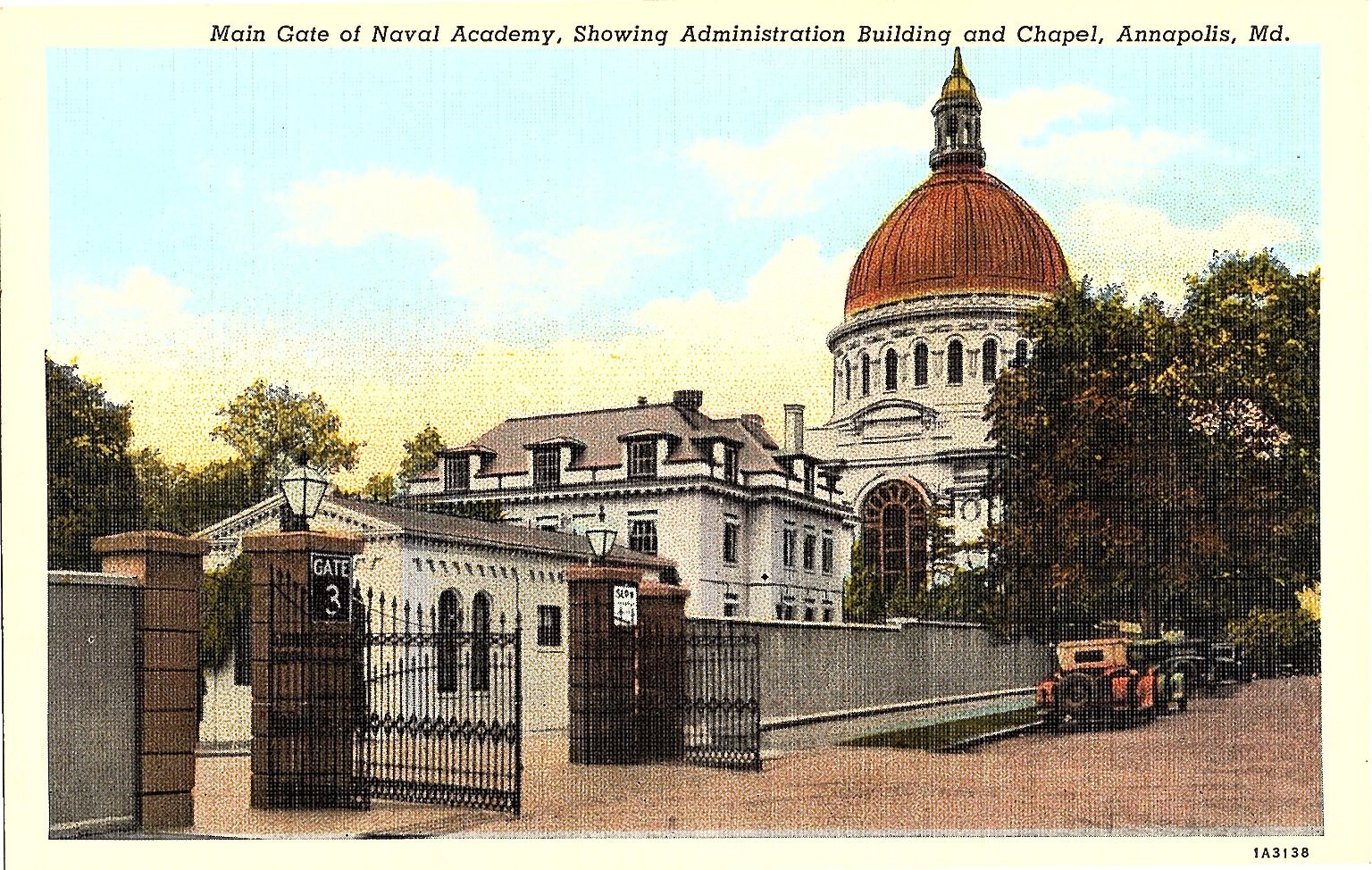 This vintage postcard features the main gate of the United States Naval Academy, showcasing the iconic Administration Building and Chapel in Annapolis, Maryland. The lithograph print is characteristic of the White B ... Read More