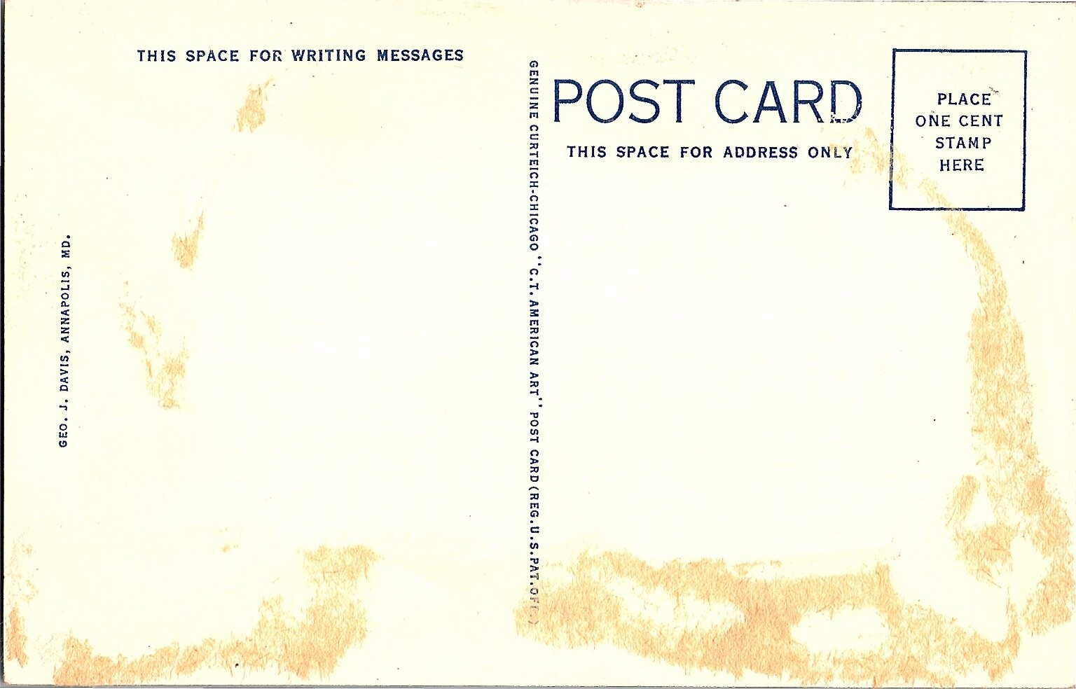 This vintage postcard features the main gate of the United States Naval Academy, showcasing the iconic Administration Building and Chapel in Annapolis, Maryland. The lithograph print is characteristic of the White Border era (1915-1930), evident in its fine dot pattern and classic color palette. The prominent red domed chapel and stately gate are beautifully captured, offering a glimpse into early 20th century military architecture and campus life.Produced by Geo. J. Davis of Annapolis and printed by Curt Teich, Chicago under their 'C.T. American Art' series, this postcard is a licensed reprint on high-quality paper with a chrome finish. The standard 5.5 x 3.5 inch size makes it a perfect collectible for enthusiasts of American history, military landmarks, or vintage postcards. The detailed illustration and historical significance of the Naval Academy make this postcard a unique addition to any collection.