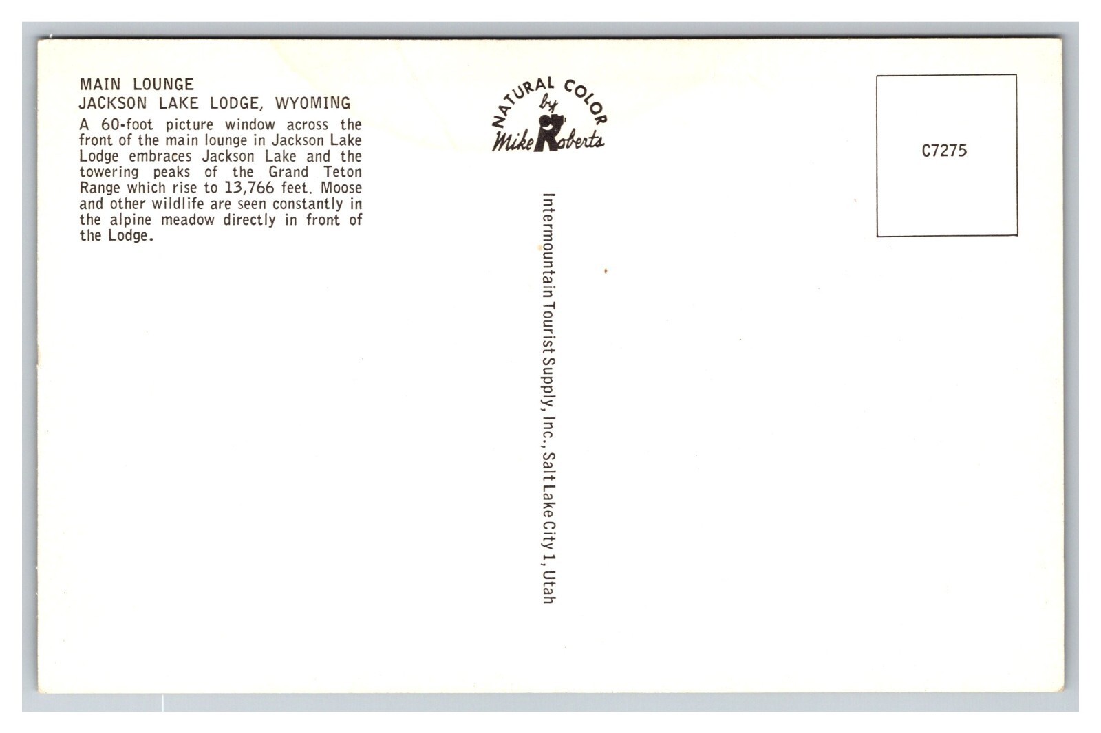 The product is a standard-sized postcard featuring a photo of the Main Lounge at Jackson Lake Lodge in Wyoming, United States. Produced by Mike Roberts Studio, the printed lithograph postcard showcases a chrome finish and depicts a city and town theme. This postcard captures a scene from North America during the Photochrome era, making it a collectible item for those interested in topographical postcards and United States history.