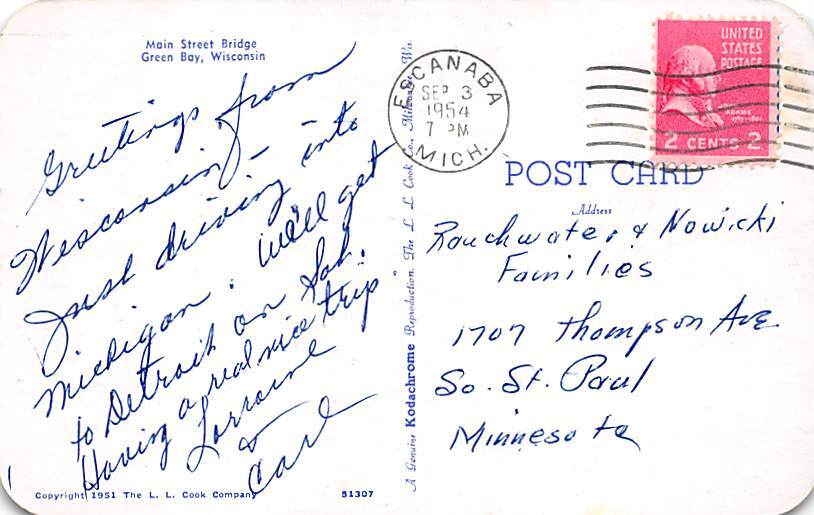 Main Street Bridge Green Bay, WI, USA Postcard - 1954 Grade: 1 - light postal marking on front Size: R - Regular Size Postcard - approximately 3 1/2 inch x 5 1/2 inch (9 CM x 14 CM) Grading Scale: Grade 1 = Per ... Read More