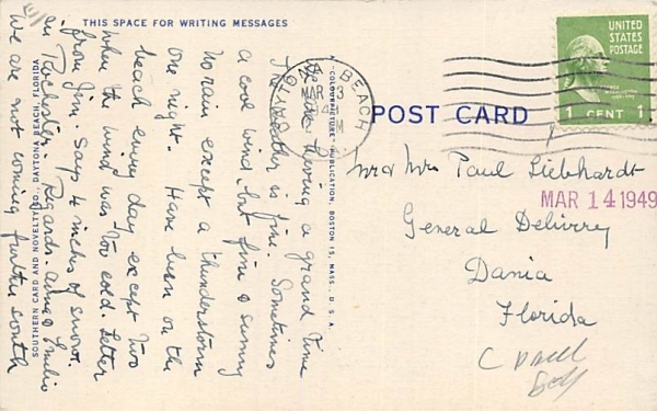 Main Street Daytona Beach, Florida Postcard - 1949 Grade: 1 Size: R - Regular size: Approx 3 1/2 X 5 1/2 inch (9 cm X 14 cm) Grading Scale: Grade 1 = Perfect corners Grade 2 = Very Minimal corner wear, no crea ... Read More