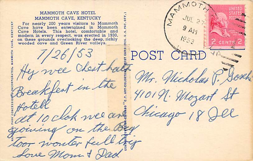 Mammoth Cave Hotel Mammoth Cave KY Postcard - 1953 Grade: 1 tape on back Size: R - Regular size: Approx 3 1/2 X 5 1/2 inch (9 cm X 14 cm) Grading Scale: Grade 1 = Perfect corners Grade 2 = Very Minimal corner ... Read More