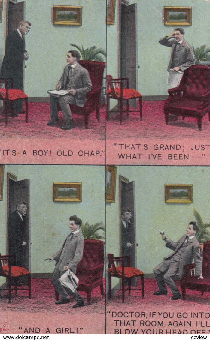 Man pulls gun on Doctor announcing babies , 1900-10s :: Antique (Vintage) Original Postcard, Standard Size (3.5 by 5.5), Litho