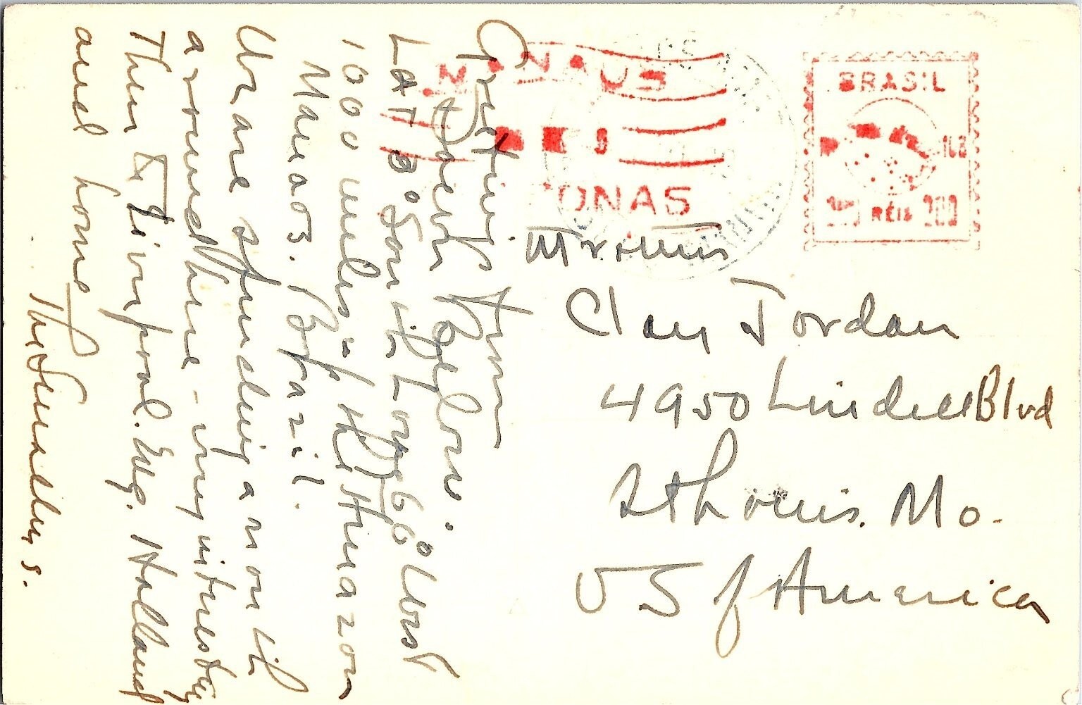 This vintage black and white postcard features a striking view of the 'Correio Geral' or General Post Office in Manaus, Brazil. The image showcases the ornate, multi-story architecture of the building, which was a central hub for communication in the Amazon region during the early to mid-20th century. The surrounding tropical foliage, including prominent palm trees, highlights the unique geographical setting of this historic city located deep within the Amazon rainforest. The reverse side of the postcard offers a fascinating glimpse into history, featuring a handwritten message sent to St. Louis, Missouri. It includes a red 'Brasil' postage stamp and a clear 'Manaus' postmark. The sender notes the specific coordinates of the city and mentions their journey through the Amazon, adding significant collectible value for those interested in postal history, Brazilian heritage, or South American travel memorabilia.