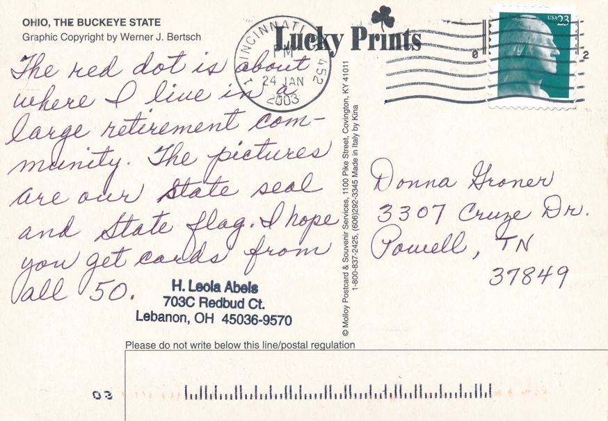 Map of Ohio - State Flag - The Buckeye State. Continental sized chrome card. Postmarked at Cincinnati OH on January 24, 2003. Average to good condition.