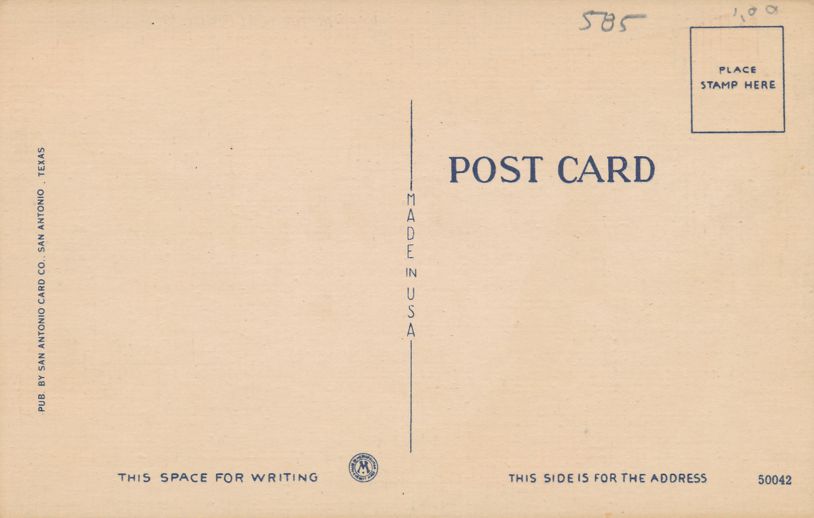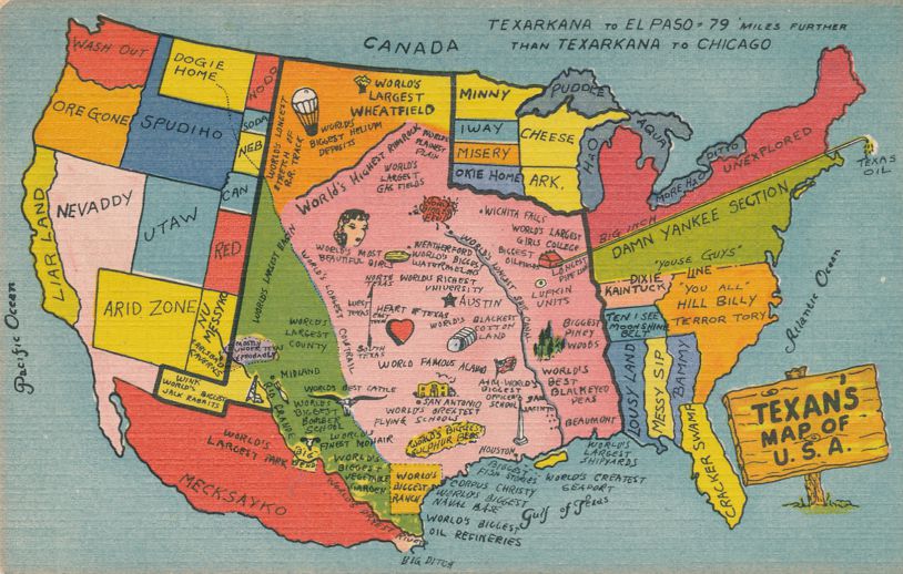 Map of the United States from Texas Persepective.Standard sized linen post card.