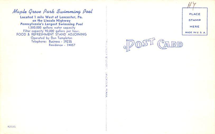 Maple Grove Park Swimming Pool Lancaster, Pennsylvania PA Postcard - Unused