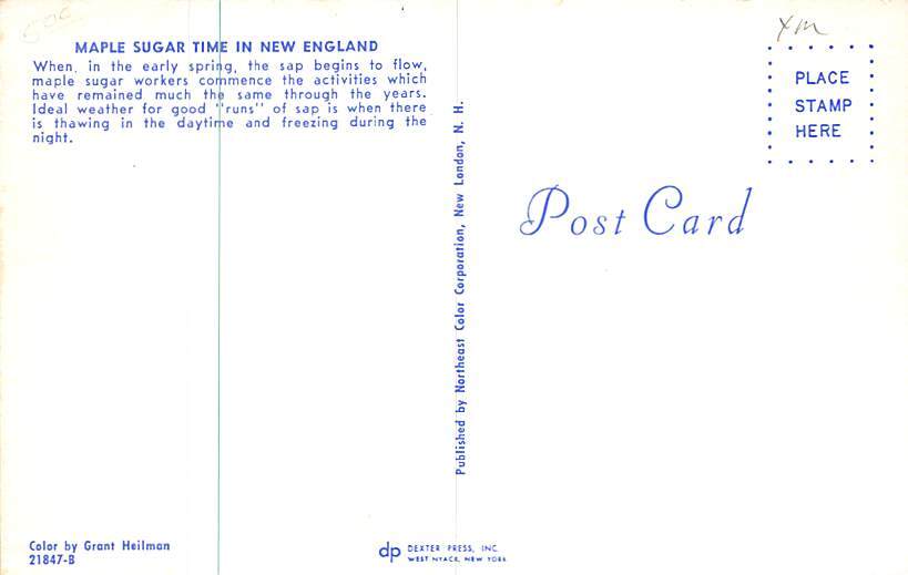Maple Sugar Time in New England Maple Syrup Postcard Postal Date: {{Product Field 4 ( Postal Used, Unused)}} Grade: 1 Size: Regular Size Postcard - approximately 3 1/2 inch x 5 1/2 inch (9 CM x 14 CM) Grading ... Read More