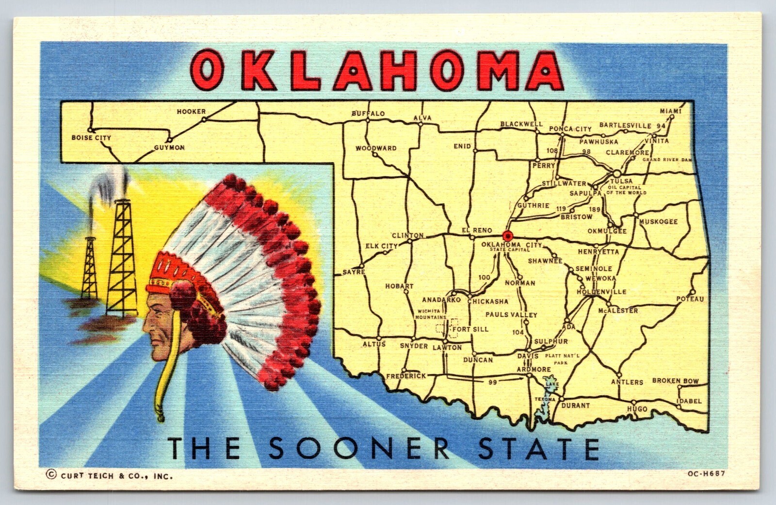 Map~Oklahoma The Sooner State~Hickasha~Altus~Vinita~Boise City~Vintage Postcard