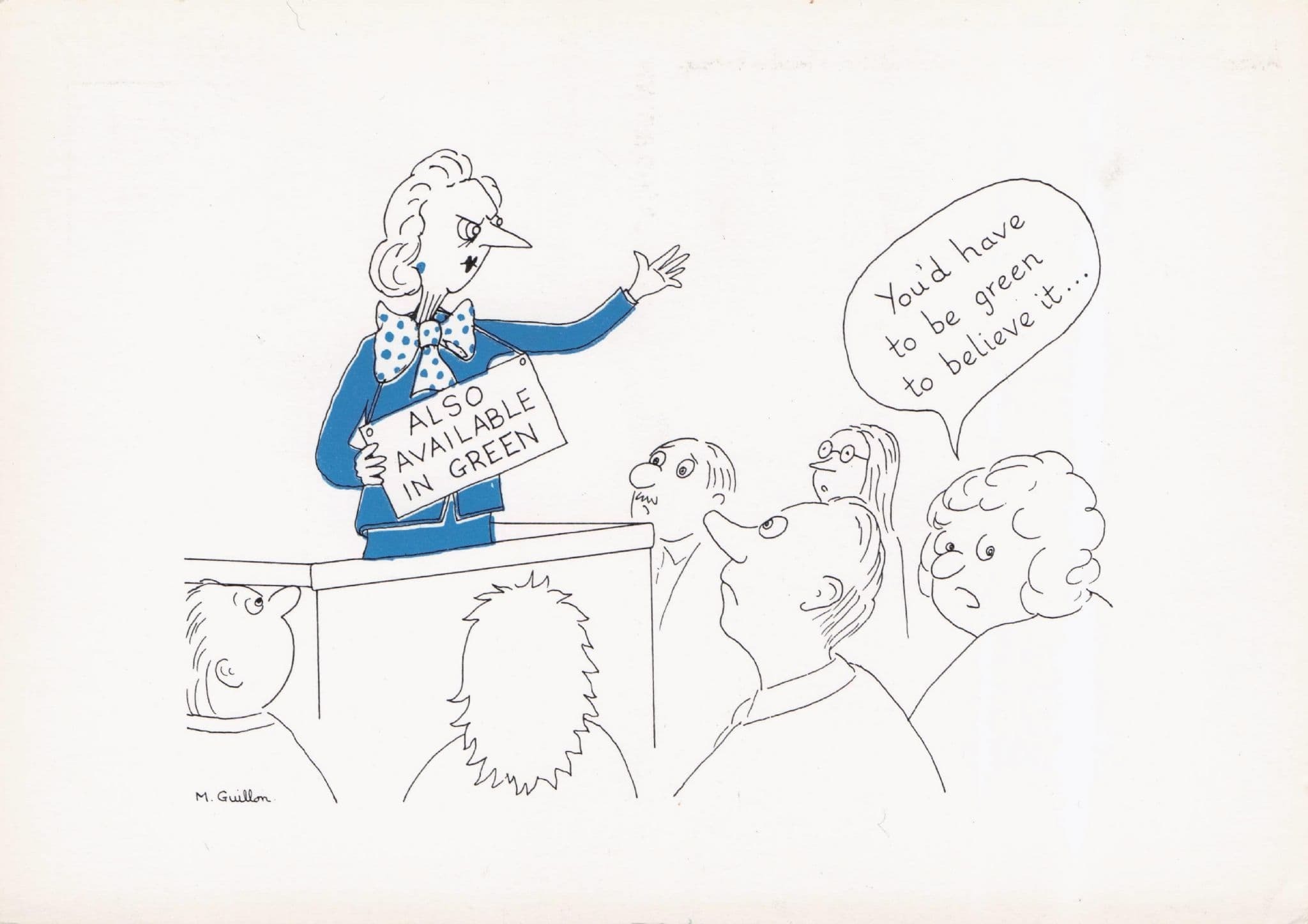 bg464x A rare circa 1980s postcard of Margaret Thatcher by art illustrator Maggie Guillon called Also Available In Green unused and mint.