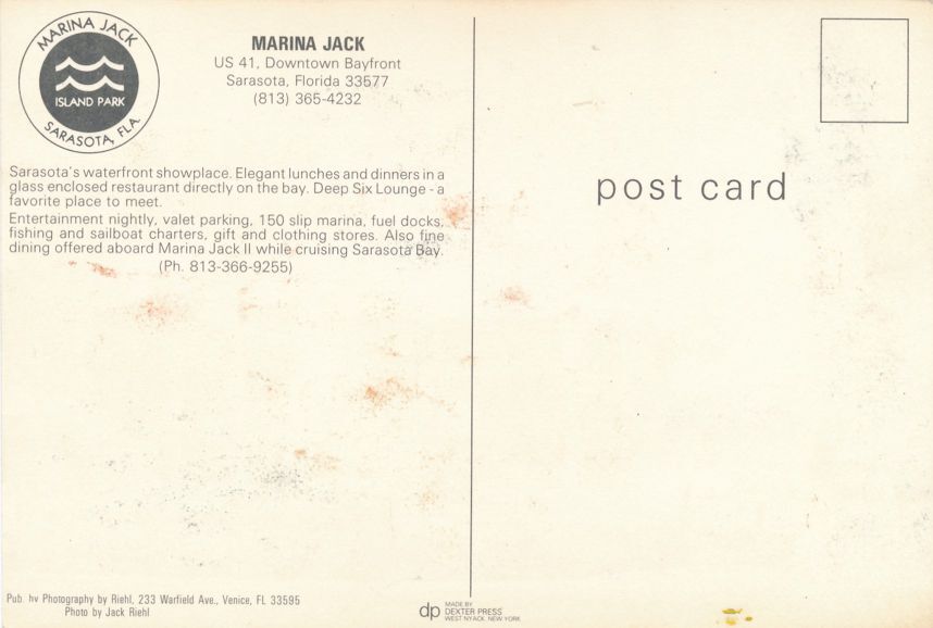 Marina Jack Bayfront Elegant Restaurant. Sarasota, Florida. Continental sized chrome card. Made by Dexter Press of West Nyack NY. Good condition - Address side a bit messy.
