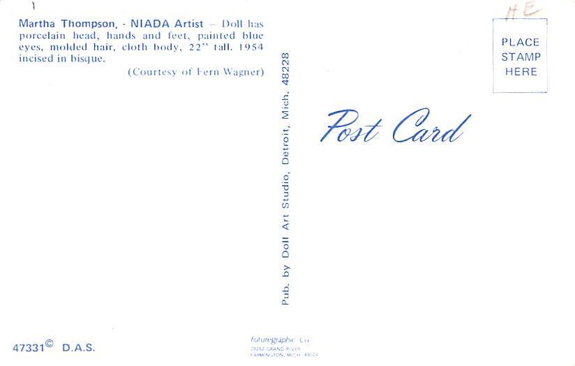 Martha Thompson Niada Artist Postcard Unused, Grade: 1, , Size: Regular Size Postcard - approximately 3 1/2 inch x 5 1/2 inch (9 CM x 14 CM) Grading Scale: Grade 1 = Perfect corners Grade 2 = Very Minimal corne ... Read More