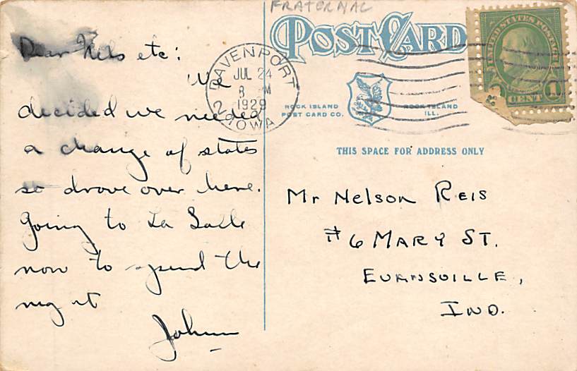Masonic Temple Davenport, Iowa Postcard - 1929 Grade: 3 writing on front Size: R - Regular size: Approx 3 1/2 X 5 1/2 inch (9 cm X 14 cm) Grading Scale: Grade 1 = Perfect corners Grade 2 = Very Minimal corner ... Read More