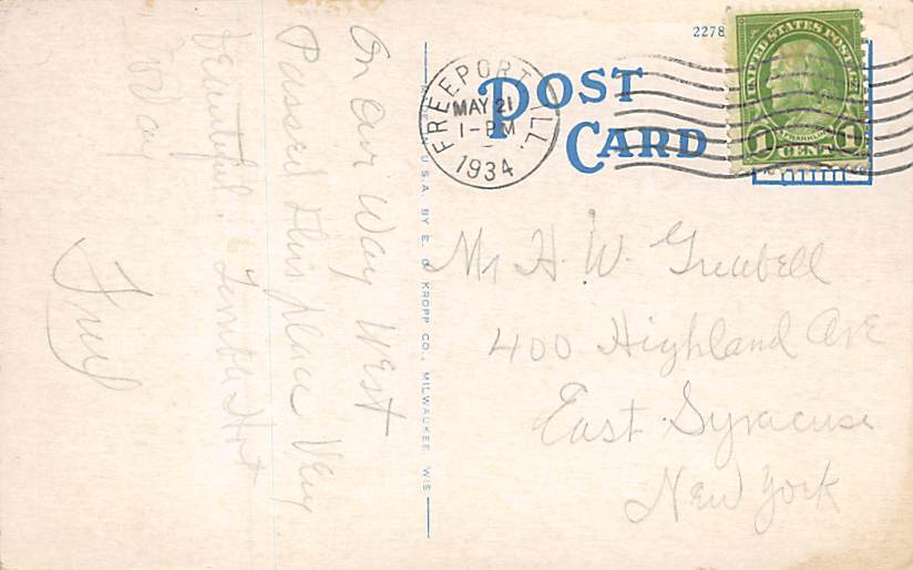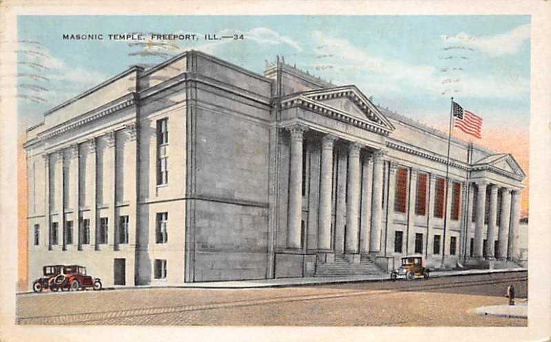 Masonic Temple Freeport Illinois Postcard - 1934 Grade: 2 - postal marking on front Size: R - Regular size: Approx 3 1/2 X 5 1/2 inch (9 cm X 14 cm) Grading Scale: Grade 1 = Perfect corners Grade 2 = Very Mini ... Read More