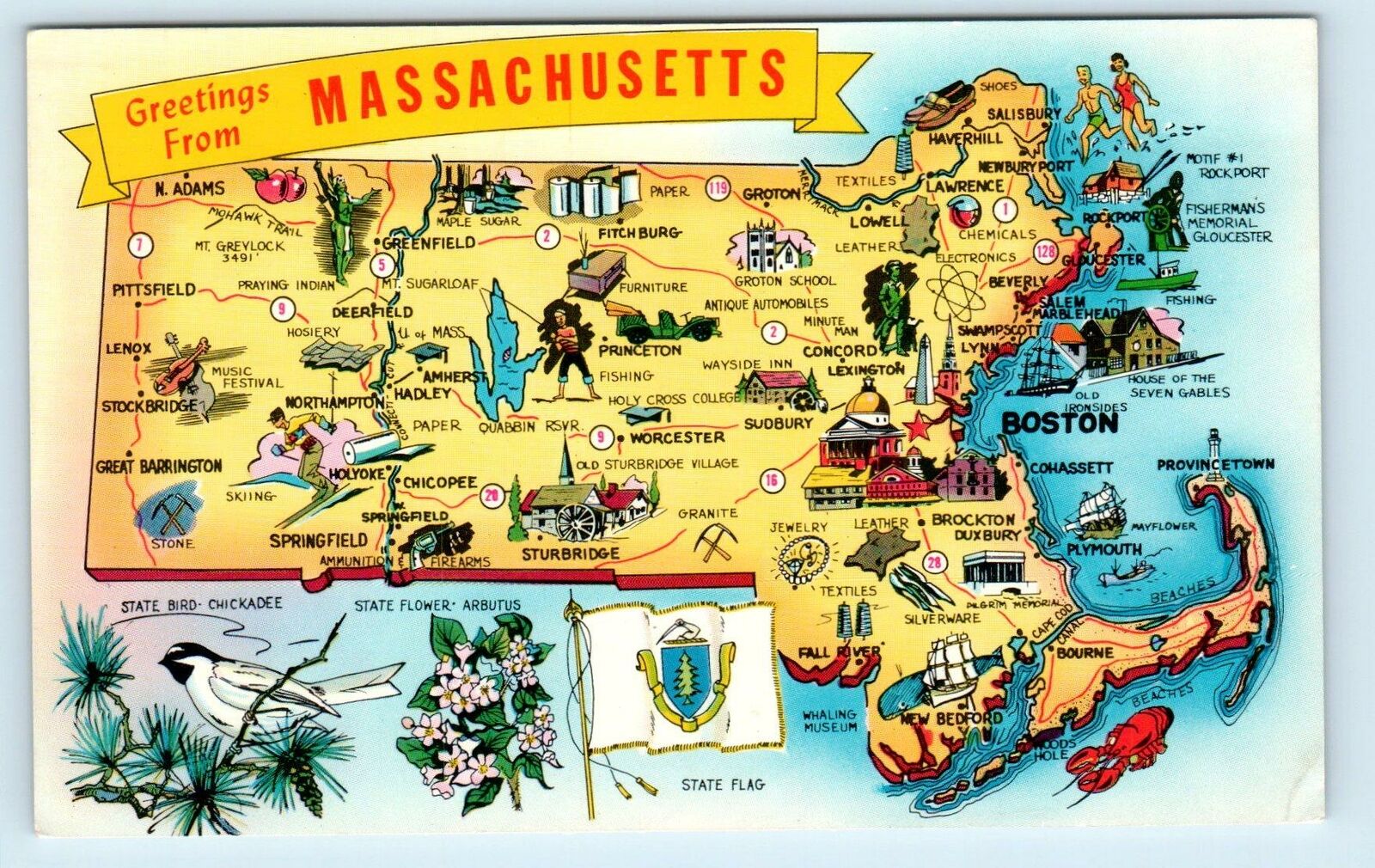MASSACHUSETTS ~ Pictorial STATE MAP Postcard c1950s by Tichnor