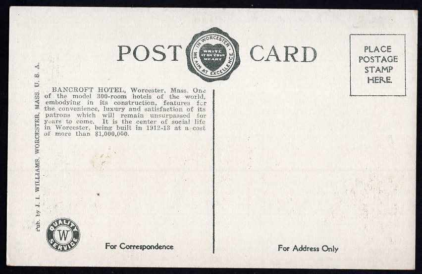 Massachusetts WORCESTER Bancroft Hotel White Border