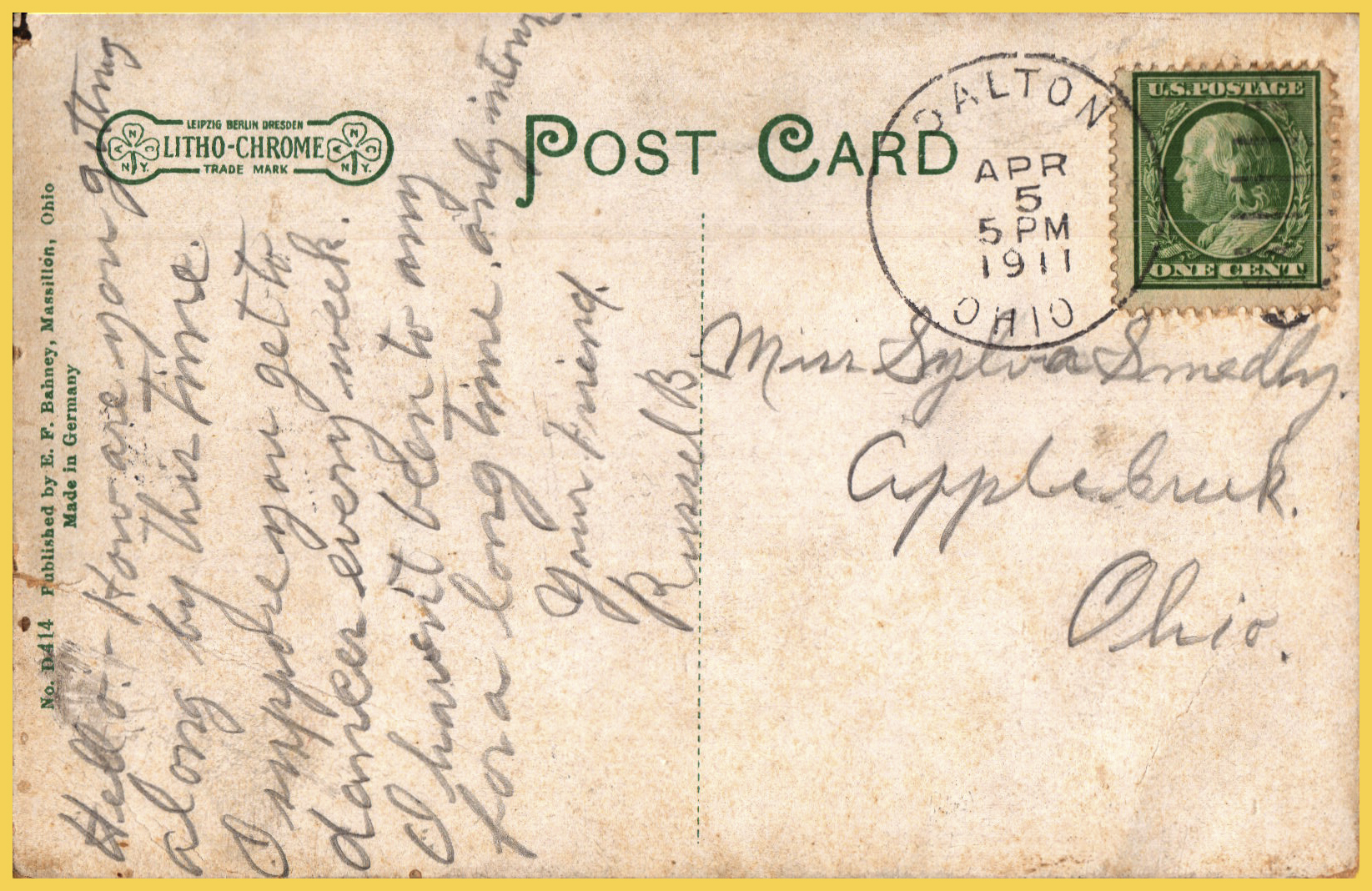 See awesome photos for condition - Postmarked Apr 5, 1911, Dalton, Ohio - E. F. Bahney / American News Company, Litho-chrome