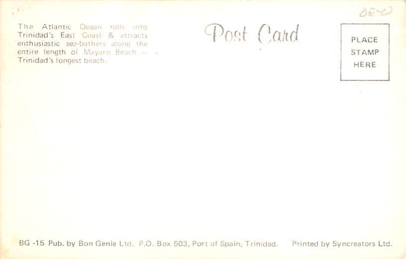 Mayaro Beach Trinidad Postcard Postcard, Grade: 1 Size: Regular Size Postcard - approximately 3 1/2 inch x 5 1/2 inch (9 CM x 14 CM) Grading Scale: Grade 1 = Perfect corners Grade 2 = Very Minimal corner wear, ... Read More