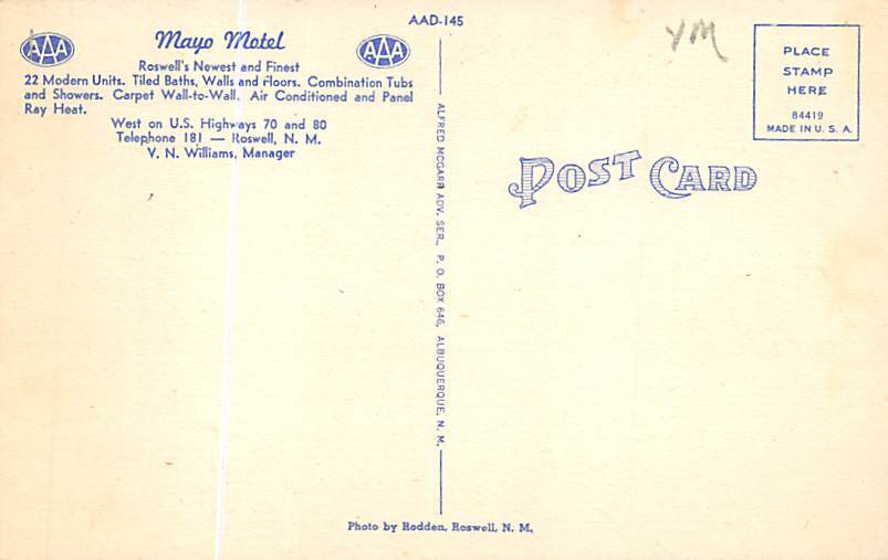 Mayo Motel Roswell, New Mexico NM Postcard - Unused