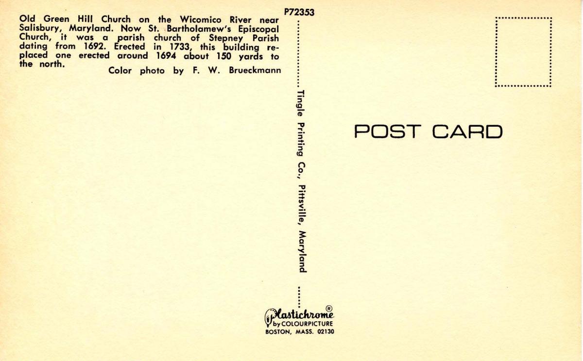 MD - Salisbury. Old Green Hill Church --- * Grading of Postcards MINT (M): Perfect condition, no apparent blemishes, flaws, postally unused, may have some writing on back. NEAR MINT (NM): Like new, image is uncomp ... Read More