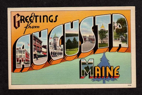 * Postcard: * Maine ME Greetings from AUGUSTA MAINE Large Letter Postcard Linen Pc Lot Details This is a Standard size postcard (3 1/2" by 5 1/2") with some corner and edge wear & some yellowing on back of card. ... Read More