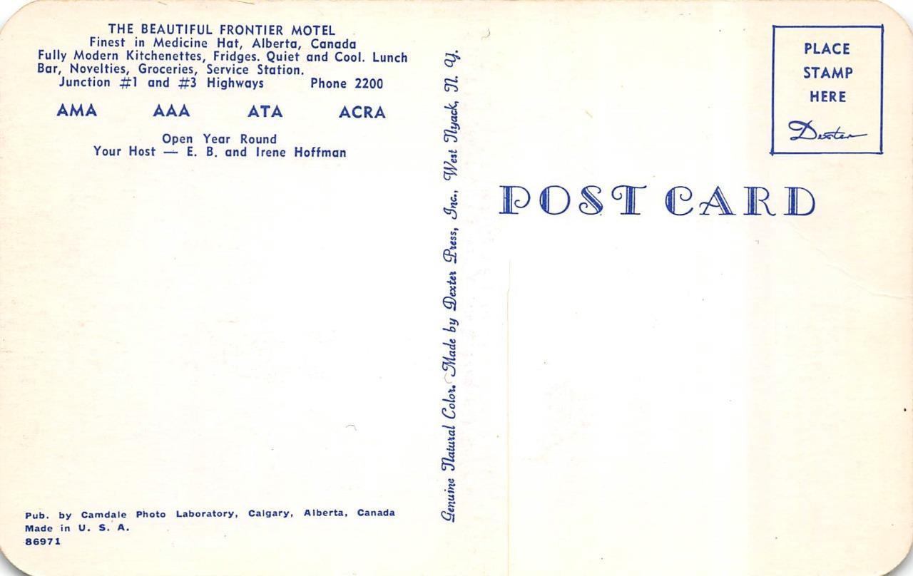 Rounded edge postcard. MEDICINE HAT, Alberta Canada FRONTIER MOTEL Roadside c1950's Chrome Postcard MEDICINE HAT, Alberta Canada FRONTIER MOTEL Roadside c1950's Chrome Postcard Click images to enlarge Description Rounded edge postcard. Please note that if in the image of the postcard back, an odd colored shadow appears on one side, it is a scanner defect and it does not appear on the card. Item is described as accurately as possible. Please View My Other Items For Sale and be sure to Add me to your Favorite Sellers. Please be sure to Visit My Hip Store, new items are listed every week. Please don't hesitate to send me a question, before or after your purchase. I want to make sure your experience is a positive one, and will respond promptly to all inquiries. I only sell standard size vintage postcards, shipped typically within 24 hours, in a cardboard stiffened envelope. I offer a full refund if you are unhappy with your purchase, so please buy with confidence. Images sell!Get Supersized Images & Free Image HostingCreate your brand with Auctiva'sCustomizable Templates.Attention Sellers - Get TemplatesImage Hosting, Scheduling at Auctiva.com.Track Page Views WithAuctiva's FREE Counter