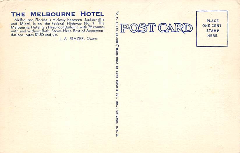 Melbourne Hotel Melbourne FL Postcard Postal Date: Unused Grade: 1 Size: Regular Size Postcard - approximately 3 1/2 inch x 5 1/2 inch (9 CM x 14 CM) Grading Scale: Grade 1 = Perfect corners Grade 2 = Very Mi ... Read More