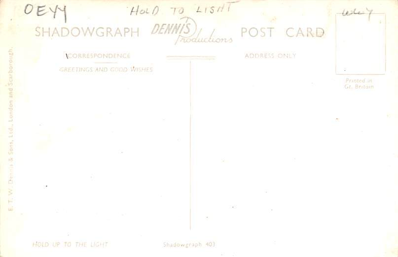 Men Legs Hold to Light Postcard Unused, Grade: 2, , Size: Regular size: Approx 3 1/2 X 5 1/2 inch (9 cm X 14 cm) Grading Scale: Grade 1 = Perfect corners Grade 2 = Very Minimal corner wear, no creases Grade 3 ... Read More