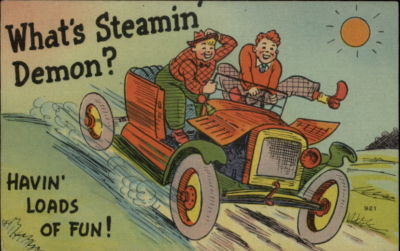 Men Speeding in Car What's Steamin' Demon Comic Postcard